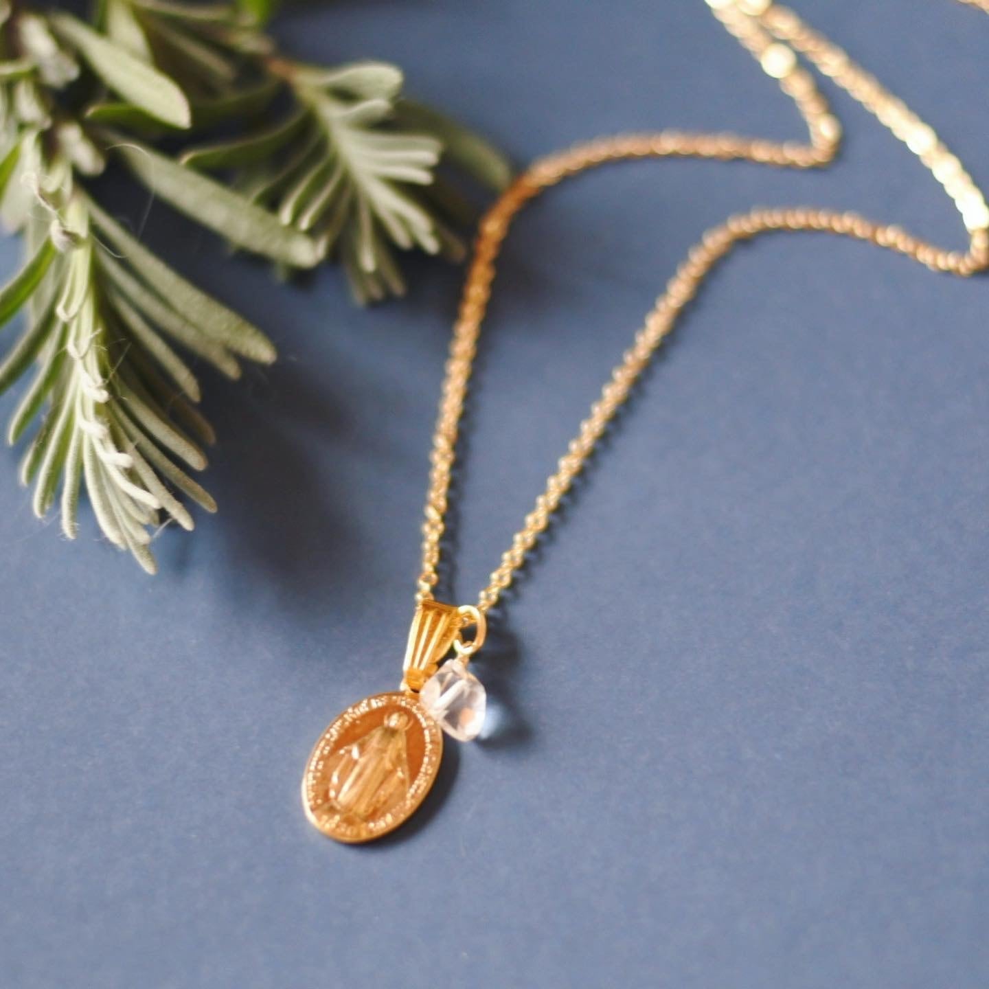4月の誕生日・ハーキマーダイヤモンドと奇跡のメダイをセットアップしたネックレスです。